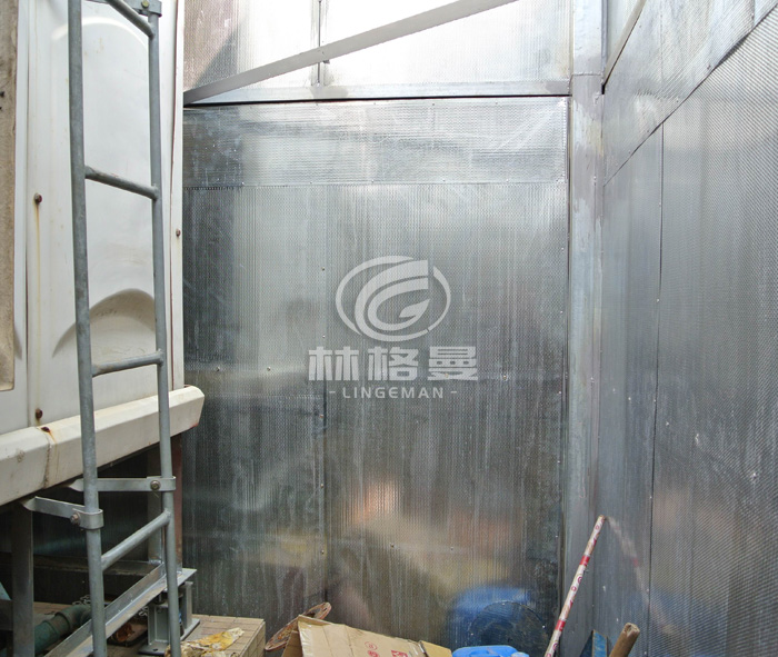 (2)罩體下部進(jìn)風(fēng)消聲系統(tǒng)主要包括:進(jìn)氣消聲器、可拆卸檢修活動版、復(fù)合隔聲層、防雨百葉、檢修消聲通道及隔聲門等。為了防止下半部落水噪聲向低層居民住宅傳播。冷卻塔下半部分安裝具有隔聲、消聲、吸聲、通風(fēng)散熱、設(shè)備檢修方便的進(jìn)風(fēng)消聲系統(tǒng)。罩體下部兩側(cè)均加裝進(jìn)風(fēng)消聲器,消聲器消聲片長度西側(cè)900mm,東側(cè)臨街部分消聲片長500mm,消聲片統(tǒng)一厚度 100mm以降低進(jìn)風(fēng)噪聲; 消聲量因消聲片長度而定。