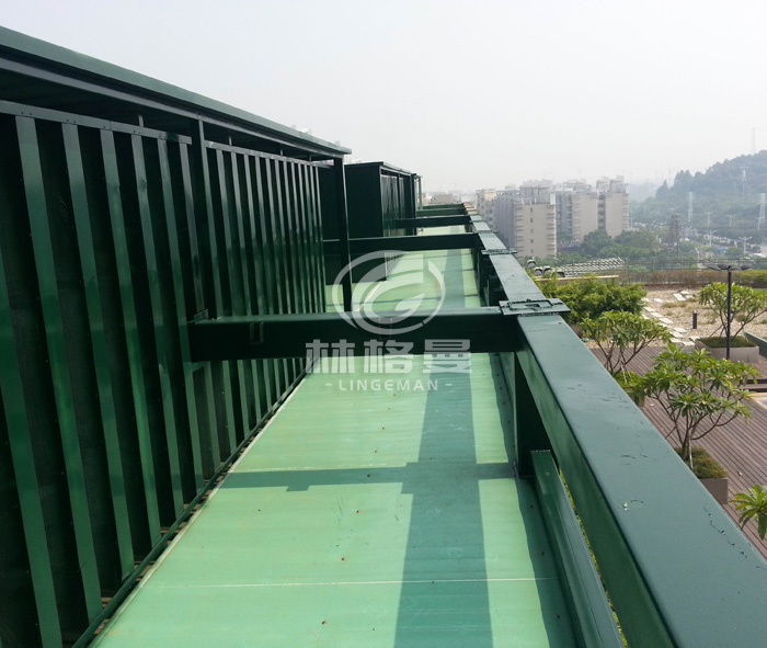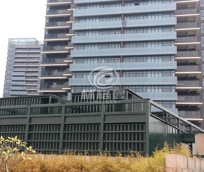 (2)罩體下部進(jìn)風(fēng)消聲系統(tǒng)主要包括:進(jìn)氣消聲器、可拆卸檢修活動(dòng)版、復(fù)合隔聲層、防雨百葉、檢修消聲通道及隔聲門等。為了防止下半部落水噪聲向低層居民住宅傳播。冷卻塔下半部分安裝具有隔聲、消聲、吸聲、通風(fēng)散熱、設(shè)備檢修方便的進(jìn)風(fēng)消聲系統(tǒng)。罩體下部?jī)蓚?cè)均加裝進(jìn)風(fēng)消聲器,消聲器消聲片長(zhǎng)度西側(cè)900mm,東側(cè)臨街部分消聲片長(zhǎng)500mm,消聲片統(tǒng)一厚度 100mm以降低進(jìn)風(fēng)噪聲; 消聲量因消聲片長(zhǎng)度而定。