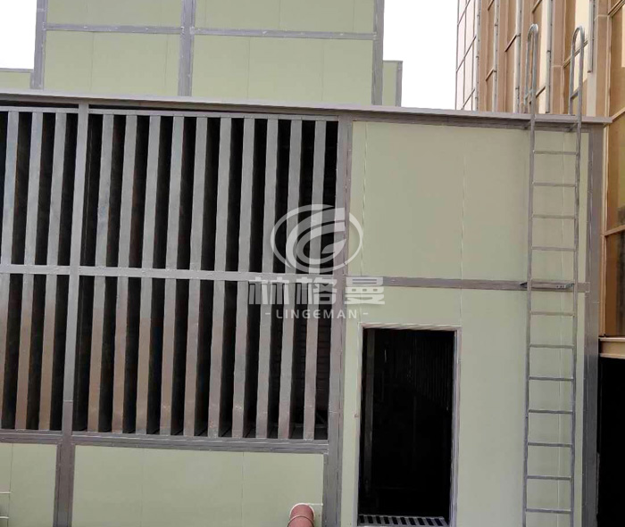 (3)塔體周圍加裝隔聲罩體,其整體結構為方鋼框架全焊接結構(詳見圖)。其厚度為80mm,外層為高密度隔聲層(彩鋼夾芯板墻板),其總隔聲量≥25dB(A)。