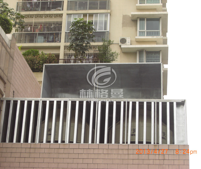 (2)罩體下部進風(fēng)消聲系統(tǒng)主要包括:進氣消聲器、可拆卸檢修活動版、復(fù)合隔聲層、防雨百葉、檢修消聲通道及隔聲門等。為了防止下半部落水噪聲向低層居民住宅傳播。冷卻塔下半部分安裝具有隔聲、消聲、吸聲、通風(fēng)散熱、設(shè)備檢修方便的進風(fēng)消聲系統(tǒng)。罩體下部兩側(cè)均加裝進風(fēng)消聲器,消聲器消聲片長度西側(cè)900mm,東側(cè)臨街部分消聲片長500mm,消聲片統(tǒng)一厚度 100mm以降低進風(fēng)噪聲; 消聲量因消聲片長度而定。