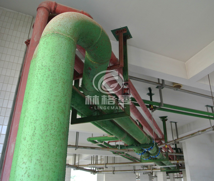 這樣可使空調(diào)主機運行時振動源在最近距離內(nèi)給予減弱,降低傳給冷凍主管的振動,彎頭至空調(diào)主機段主管安裝彈簧減振器支承。